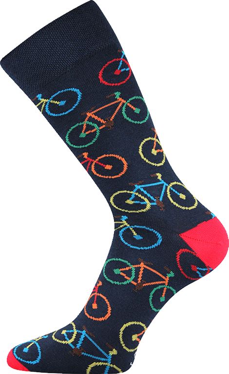 Společenské trendy vzorované ponožky, řetízkovaná špice, jemný svěr lemu, tmavě modrá ponožka s červenou špičkou a patou